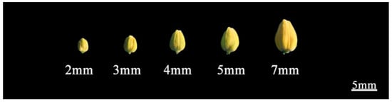 The analysis of mitosis in the three restorer lines was performed according to the method reported by Wang et al. (2021) []. Briefly, seeds of R2000, CLR650, and Zhehuhong were soaked in ddH2O for 6 h. The seeds then were transferred to a Petri dish covered with sterilized filter paper and germinated under dark conditions at 25 °C. During the process of germination, the filter paper remained moist. After seeds germinated and the root tip grew to a length of 2 cm, the root tips were cut and put into 0.002 mol L−1 of 8-hydroxyquinoline solution. The root tips in solution were kept under dark conditions at room temperature for 2 h. The root tips were transferred to Carnoy’s fixative solution for 24 h. The fixed root tips were stored in 70% ethanol solution at 4 °C.