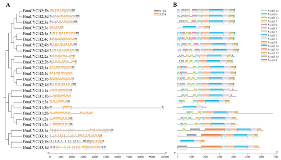 Fifteen conserved motifs were identified in the full-length BnaCYCB proteins. Motifs 1 and 3 were observed in all 25 BnaCYCB proteins (Figure 2B), and most proteins contained motifs 2, 5, and 4. Motifs 2 and 5 were not found in BnaCYCB2;3c, BnaCYCB1;3b, or BnaCYCB3;1b, and motif 4 was not found in three Group 1 members (BnaCYCB1;1a, BnaCYCB1;1b, BnaCYCB1;3b) (Figure 2B). Motifs 9, 11, 13, and 14 were observed only in Group 2, and motifs 8 and 10 were observed only in Group 3. The BnaCYCB2 subfamily contained the most motifs, in contrast to the BnaCYCB3 subfamily with the least motifs, indicating a functional divergence in BnaCYCB subfamilies.