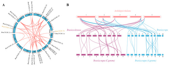 The 24 BnaCYCB genes were located on 14 chromosomes, and BnaCYCB1;3a was located on a scaffold, with 11 genes in the A subgenome and 13 in the C subgenome (Figure 3A). No BnaCYCB genes were found on chromosomes A02, A04, A05, A10, or C04. All chromosomes with BnaCYCB contained one or two genes, except A06 and C03 with three gene locations (Figure 3A). In B. napus, 40 pairs composed of 23 CYCB genes were predicted to share syntenic relationships, with tandem duplications found in BnaCYCB2;4a, BnaCYCB2;4b, BnaCYCB2;4c, and BnaCYCB2;4d (Figure 3A).