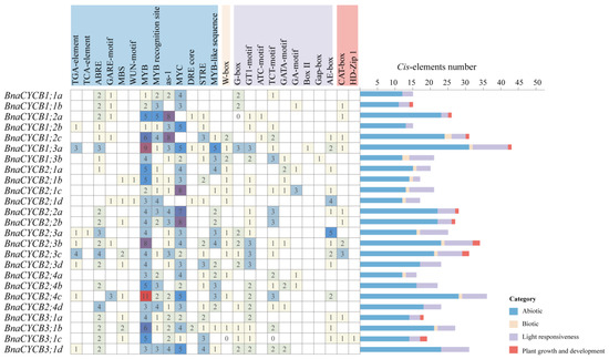 Cis-acting elements affected gene transcription and expression. The analysis showed that the promoter regions of CYCB genes contained a lot of cis-acting elements involving various biological processes. We excluded the components with general transcriptional regulatory elements (TATA-box, CAAT-box, AT~TATA-box), non-Brassicaceae elements, and uncertain function elements and then divided the remained elements into four categories: abiotic, biotic, light response, and growth and development elements. The abiotic response category was the largest, in which drought stress-responsive elements (MBS, MYB, MYC, MYB recognition site, MYB recognition site) were major and were found in most genes, revealing that BnaCYCB genes may be extremely sensitive to drought (Figure 4). Most BnaCYCB genes’ promoter regions contained hormone response elements, including abscisic acid (20), auxin (7), gibberellin A3 (7), and ethylene response elements (2). In addition, there was a major proportion of light response elements in BnaCYCB gene promoter regions (G-box, GT1-motif, ATC-motif, TCT-motif, GATA-motif, GA-motif, Box-II, Gap-box, AE-box) (Figure 4), suggesting the important role of BnaCYCB genes in B. napus growth.