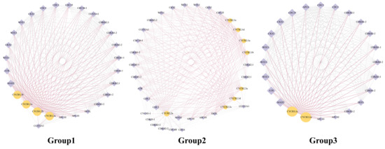 Protein networks for BnaCYCB in Groups 1, 2, and 3. Yellow circles indicate CYCB members, and purple diamonds indicate candidate proteins. The size of the icons represents the degree of the network. Purple lines represent the adjacent edges of CYCB members.