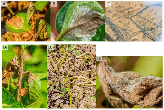 By far, late blight is the most devastating potato disease worldwide [] and is part of the downy mildews group of plant diseases. They are caused by Oomycetes and not by fungi, being fungi-like microorganisms. The disease is characterized by a necrotic lesion in the upper face of the leaf that starts as a chlorotic spot; typically, the lesion is water-soaked or oily, surrounded by a light-green-coloured edge (Figure 1A). On the underside of the leaf, white down fuzzy mycelia are observed (Figure 1B), where the sporangia are produced (Figure 1B,C). Symptoms on the stem and petioles are brown to dark necrotic lesions [] (Figure 1D1–D3).