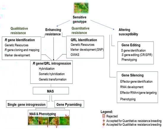 This resistance, based on a single or a small number of dominant R genes, is called qualitative resistance, and it offers immunity or total resistance against this pathogen. However, it is easily breakable. The other type of resistance is called quantitative resistance, which is not total, and it is controlled by several genes, each one contributing somewhat to resistance. This resistance is considered durable. For breeding this type of resistance, breeders look for quantitative resistance loci (QRLs) (Figure 2).
