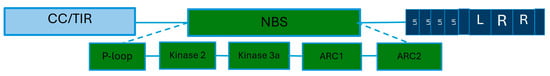 Plant resistance genes are classified mainly into five classes, according to Bezerra-Neto et al. [], based on their conserved domains. The first is the NLR (Nucleotide binding-site Leucine rich-repeat) class. It is the largest class, and the majority of plant R genes belong to it. It is divided into two subfamilies: CC-NLR and TIR-NLR. The second is TM-LRR, the third is RLK (Receptor-Like Kinase), the fourth is STK (Serine/Threonine Kinase), and the fifth is CC (Coiled Coil). Classes II, III, and V are located in the plant cytoplasmic membrane, and classes I and IV are cytoplasmic.