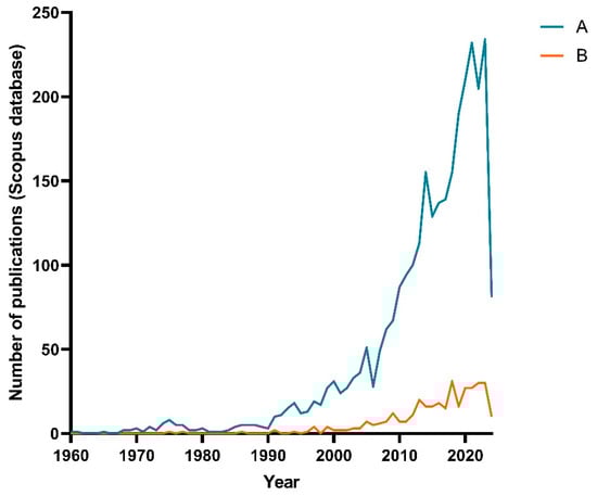 A bibliometric analysis was performed utilizing the Scopus database to provide scientific depth and perspective on applying medicinal plant-derived polysaccharides. Two independent searches were conducted (A and B) using the Boolean operators “AND” for three different terms: (A-1) “polysaccharides”; (A-2) “extraction”; (A-3) “plants”. For the second search (B), another term was included: “medicinal”. For both of them, “AND NOT” operator was used for three other different terms: (A-I) fungi; (A-II) algae; (A-III) mushrooms. This was needed further to specify the literature on the topic of interest. Then, the number of publications over the years was plotted as shown in Figure 1.