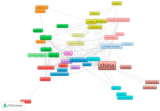 Cluster overview regarding country collaboration under the topic of the search query. The search was performed using the terms “Polysaccharides,” “Extraction,” “Medicinal,” and “Plants.” For both search queries, the “AND NOT” Boolean operator was used alongside the terms “fungi,” “algae,” and “mushroom” to try to avoid misinterpretation of the number of articles found since those terms are commonly associated with polysaccharides.
