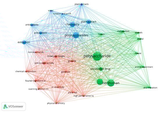 Cluster overview of keyword co-occurrence pattern from the above-mentioned search query. Search was performed containing terms “Polysaccharides”, “Extraction”, “Medicinal” and “Plants”. For both search queries, “AND NOT” Boolean operator was used alongside terms “fungi”, “algae”, and “mushroom” to try to avoid misinterpretation of the number of articles found, since those terms are commonly associated with polysaccharides.