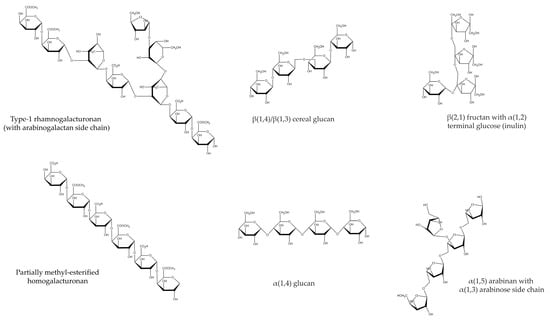 It is noteworthy that plant polysaccharides are trending studied molecules for bioactive purposes. Polysaccharides are macromolecules composed of glycosidic subunits called monosaccharides. Both homopolymer and heteropolymer chains are common in nature. Those can be digested and absorbed by humans, such as conventional starch. Others cannot be digested by human enzymes and are defined as dietary fibers, such as pectins, β-glucans, resistant starch, and others. Structural complexity is another parameter that can differentiate between subclasses of polysaccharides. Besides elemental glycosidic composition, degree of branching, methylation, acetylation, linkage type, and conjugated structures contribute to molecular complexity [,].