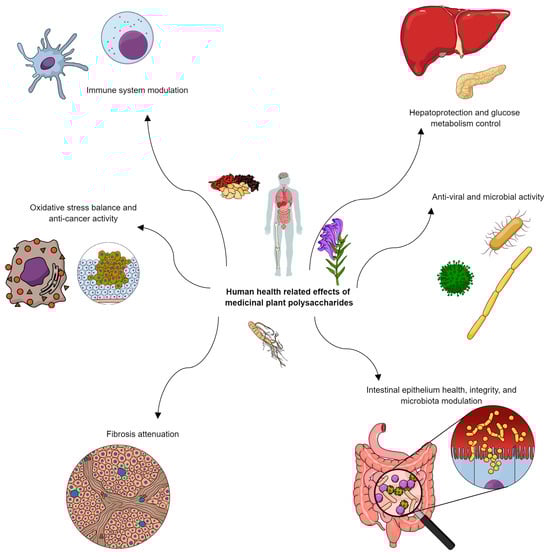 Although having a complex structure with varied bioactivities, natural and synthetic modifications can be performed on polysaccharide backbones such as phosphorylation, amination, selenization, and others. A great review focusing solely on the antioxidant profile of polysaccharides, with special observations regarding substituted groups and conjugates, has been made before []. The focus here will be once more specifically on medicinal plants’ polysaccharides and what information we have until now regarding reports of those, focusing whenever possible on health effects.