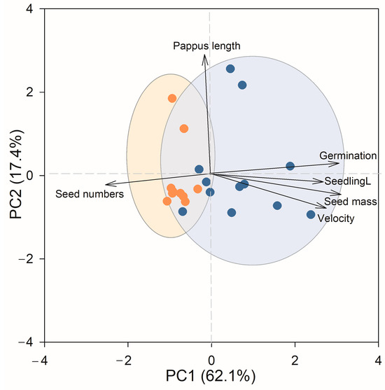 Five plants were selected from each population, and 20 capitula were chosen from each plant to count the seed numbers per capitula. In total, 2200 capitula were collected (20 flower heads × 5 plants × 22 populations). The average value for each plant was calculated as a replicate. To measure other traits of the seeds, we collected three sets of 50 seeds from each plant and selected five plants per population. Pappus length was measured by scanning each sample using an EPSON flatbed scanner (v550; Epson China, Beijing, China) and analyzing the images with ImageJ version 1.25a [48] (see Figure S1 for measurement details). Each sample of 50 seeds was weighed using an analytical balance (accuracy = 0.0001 g), and the mass of one seed was calculated. The average value for each plant was calculated as a replicate.
