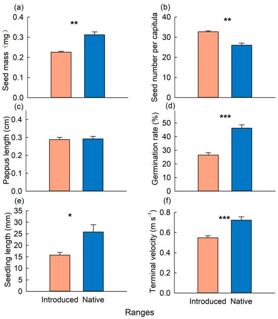 Seed mass (a), seed number per capitula (b), pappus length (c), germination rate (d), seedling length (e), and terminal velocity (f) of Chromolaena odorata from the the introduced and native populations. *, **, and *** indicate p < 0.05, p < 0.01, and p < 0.001.
