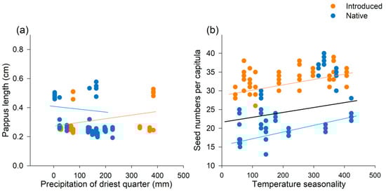 Relationships between climatic conditions vs. seed traits for the 12 native and 10 introduced populations of Chromolaena odorata. (a) Relationship between pappus length and precipitation of driest quarter. (b) Relationship between seed number per capitula and temperature seasonality. Orange dots and lines indicate data from introduced populations and blue dots and lines indicate data from native populations. The black line indicates data that includes both range populations. Data are presented at the individual level. Lines are shown for models that had significant relationships at p < 0.05.