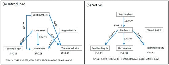 Structural equation modeling (SEM) was used to detect the effects of seed morphological traits on germination and terminal velocity in introduced and native populations using the lavaan package in R [53]. We used criteria including p values, chi-square values, comparative fit index (CFI), and root mean square error of approximation (RMSEA) to evaluate the SEM fit. The fit was considered perfect when the chi-square test was insignificant (p > 0.05), CFI was close to 1.000, and RMSEA and SRMR values were lower than 0.05 [54].