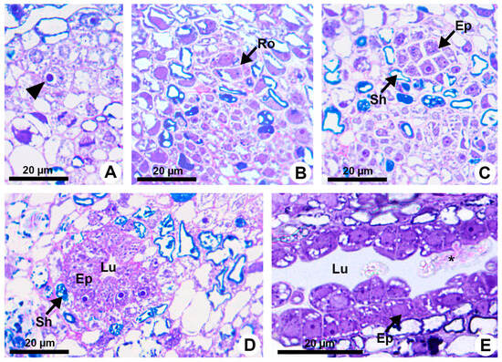 For DNA labeling, samples fixed in Karnovsky’s solution were sectioned free-hand and stained with DAPI (4′,6-diamidino-2-phenylindole; 1 mg.mL−1) in phosphate-buffered saline (PBS) and 1% Triton X-100 (Sigma, St. Louis, MO, USA), washed in water and mounted in an antifade mounting medium [65]. The slides were analyzed using a Zeiss LSM880 confocal laser microscope (Carl Zeiss, Oberkochen, Germany) at 405 nm wavelength.