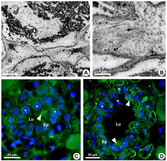 Enzymatic activity and microtubule organization in developing resin ducts of Kielmeyera appariciana Saddi. Transverse sections. (A,B) Transmission electron microscopy. (A) Pectinase activity detected in the middle lamella (arrow). Note the emergence of a narrow intercellular space. (B) Cellulase activity detected in the cell wall of the epithelial cells (arrow), facing the intercellular space. (C,D) Immunolocalization of microtubules (green) and DNA labeling (blue) under confocal laser microscopy. Note the polarized organization of microtubules in some epithelial cells (arrowhead) and nuclei with regions of condensed chromatin (asterisk) (CW = cell wall; Ep = epithelium; IS = intercellular space; Lu = lumen).