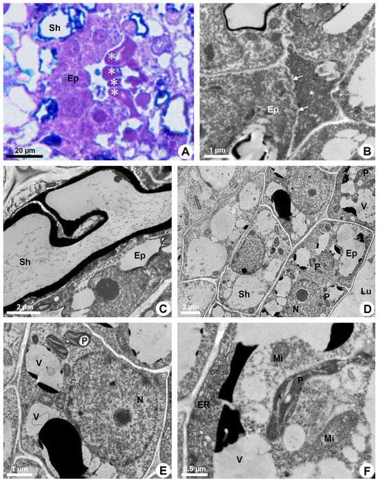 Secretory process in resin ducts of Kielmeyera appariciana Saddi. (A) Light microscopy. Bright field. (B–F) Transmission electron microscopy. (A,B,F) Transverse sections. (C–E) Longitudinal sections. (A,B) Mature ducts. (A) Epithelial cells in programmed cell death (PCD) evidenced by darkened cytoplasm (asterisk). (B) Degenerated protoplast of an epithelial cell (asterisk) in PCD. Note a living epithelial cell with a shrunken periclinal cell wall (arrow). (C–F) Epithelial cells during the secretory phase. Young ducts. (C) Epithelial cell with a voluminous nucleus and evident nucleolus. Note the sheath cell with a large vacuole containing phenolic compounds. (D,E) General view of epithelial cells. Note the presence of numerous elaioplasts and secretory vacuoles. (F) Epithelial cell with parietal endoplasmic reticulum, large elaioplast, mitochondria and secretory vacuoles (Ep = epithelium; ER = endoplasmic reticulum; Lu = lumen; Mi = mitochondrion; N = nucleus; P = elaioplast; Sh = sheath; V = vacuole).