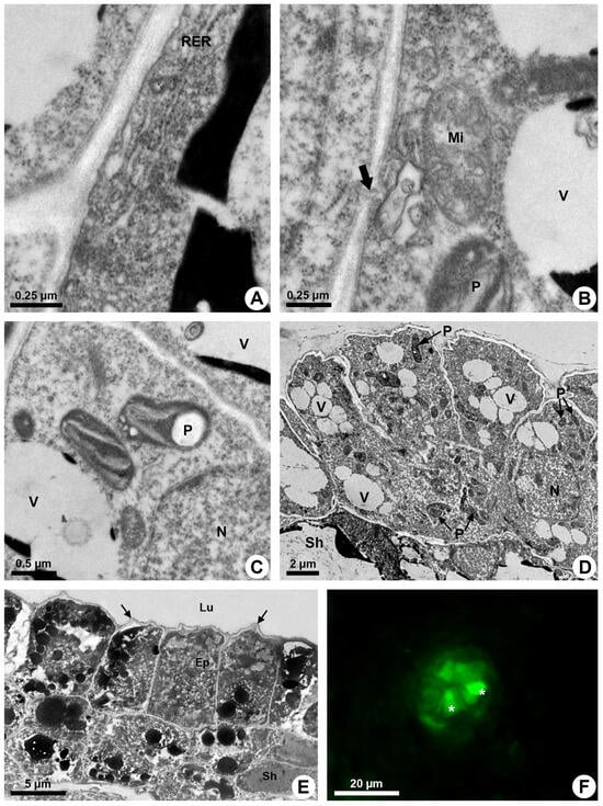 Secretory process in resin ducts of Kielmeyera appariciana Saddi. (A–E) Transmission electron microscopy. (F) Fluorescence microscopy. (A–D) Young ducts. (E,F) Mature ducts. (A) Epithelial cell with parietal rough endoplasmic reticulum. (B) Mitochondrion with distinct cristae near cell wall, where a plasmodesma is observed (large arrow). (C) Elaioplasts with few wide thylakoids. Note the presence of a large starch grain. (D) General view of the epithelium with cells containing many elaioplasts and dispersed vacuome. (E) Epithelial cells containing many vacuoles and vesicles with electron-dense material at the end of the secretory phase. Note the shrunken periclinal cell walls facing the lumen (narrow arrow). (F) ROS detected in epithelial cells (asterisk) treated with DCFH-DA (Ep = epithelium; Lu = lumen; Mi = mitochondrion; N = nucleus; P = elaioplast; RER = rough endoplasmic reticulum; Sh = sheath; V = vacuole).