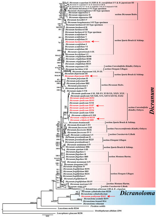 Phylogeny of Dicranum species inferred from the combined dataset (trnH-psbA, rps4-trnT, trnL-trnF, rps19-rpl2, rpoB, and ITS). The topology derived from the best-scoring ML tree in IQtree is shown. ML bootstrap values BS ≥ 70 are shown on the left and Bayesian posterior probabilities values PP ≥ 0.90 on the right. The subject species are in red and indicated by arrows. Section division refers to Hodgetts et al. [37].