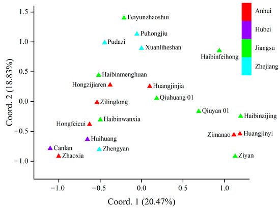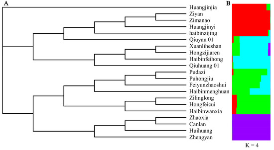 To analyze the genetic relationships among the cultivars, principal coordinate analysis (PCoA) was carried out. The genetic relationships of the T. sebifera cultivars were independent of their origins (Figure 1). Only the cultivars from Hubei (Canlan and Huihuang) showed a close genetic relationship, while there were obvious genetic differences among the cultivars from other shared regions (Anhui, Jiangsu, or Zhejiang). Moreover, Bayesian clustering analysis and phylogenetic tree construction based on the neighbor-joining method were also carried out to analyze the genetic structure (Figure 2). The optimal K value was 4, which indicated that the cultivars were clustered into four groups (Figure S1). Most of the PCoA, Bayesian clustering analysis, and phylogenetic tree results were similar. However, according to the phylogenetic tree, the cultivar ‘Huangjinjia’ showed significant genetic variation and clustered into one group.