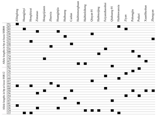 Fingerprints of the 21 cultivars based on 2 SSR loci (SSR08 and SSR12).