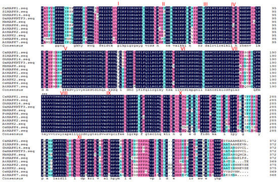 Mitogen-activated protein kinases have been reported to play a vital role in the plant immune response against pathogens. However, there is limited knowledge regarding the specific role of MAPKs in plant immunity against Ralstonia solanacearum, especially in pepper. To identify MAPK that might function in pepper immunity in response to R. solanacearum, we searched the RNA-seq data previously published [23]. CaMAPK1, which exhibited an up-regulated expression pattern in the hypocotyl of pepper plants infected by R. solanacearum, aroused our attention. Similar to other MAPKs, CaMAPK1 contains 11 domains that are found to be conversed among the members of serine/threonine protein kinases along with a TEY motif (Figure 1). The predicted protein size and theoretical pI of CaMAPK1 were 42.7 kDa and 6.32, respectively. The similarity of the CaMAPK1 protein sequence and its orthologs from other plant species was compared and analyzed, and the results indicated that CaMAPK1 shares high amino acid identities (>90%) with MAPKs in other plants, including tomato, tobacco, rice, and Arabidopsis, including a 98% match with SlMAPK9 in tomato.