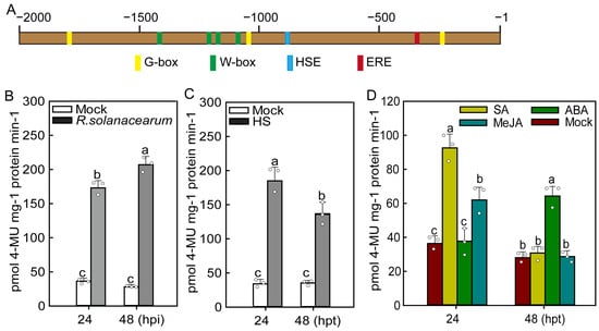 The activities of CaMAPK1 promoter was enhanced in response to R. solanacearum inoculation, heat stress, and chemical treatments. (A) The motifs contained in the upstream promoter of CaMAPK1 with a length of 2000 bp. HSE, heat stress element; ERE, ethylene-responsive element. (B,C) Enhancements of the activity of CaMAPK1 promoter at 24 and 48 h post inoculation with R. solanacearum (B) and exposed to HS (C). (D) Enhancements of promoter activity of CaMAPK1 at 24 and 48 h post chemical treatments, including SA, MeJA, and ABA. (B–D) Agrobacterium cells carrying pCaMAPK1:GUS were infiltrated into the leaves of pepper plants and the agroinfiltrated plants recovered for 24 h, followed by R. solanacearum inoculation, heat stress, and chemical treatments. At 24 and 48 post treatments, the agroinfiltrated leaves were harvested for the measurement of GUS activities. Hollow dots represent data from 3 independent experiments. All treatments were repeated three times with similar results. Different letters indicate significant differences as determined by Fisher’s protected LSD test (p < 0.01). LSD, least significant difference.