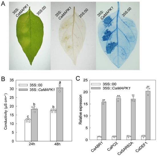 To determine the potential role of CaMAPK1 in cell death and defense response, transient expression of CaMAPK1 was performed in the leaves of pepper plants. Leaves transiently expressing CaMAPK1 for 48 h triggered an intensive chlorosis and cell death response (Figure 4A). By contrast, pepper leaves transiently expressed with empty vector exhibited no chlorosis and cell death. Cell death was measured by electrolyte leakage from leaf discs agroinfiltrated with CaMAPK1 or empty vector (Figure 4B). In addition, Agrobacterium-mediated transient expression of CaMAPK1 in pepper leaves induced H2O2 accumulation at the infiltrated site, as determined by diaminobenzidine (DAB) staining (Figure 4A). H2O2 from oxidative bursts is known to drive programmed cell death at challenged sites [24]. To determine whether the transient expression of CaMAPK1 triggered a defense response in pepper leaves, the transcript accumulations of defense-associated genes in pepper leaves transiently transformed with CaMAPK1 were evaluated. The results show that CaMAPK1 overexpression in pepper leaves upregulated the expression of defense- and hormones-associated genes, including CaABR1, CaPO2, CaSAR82A, and CaDEF1 (Figure 4C), suggesting that CaMAPK1 expression is associated with defense response in pepper leaves.