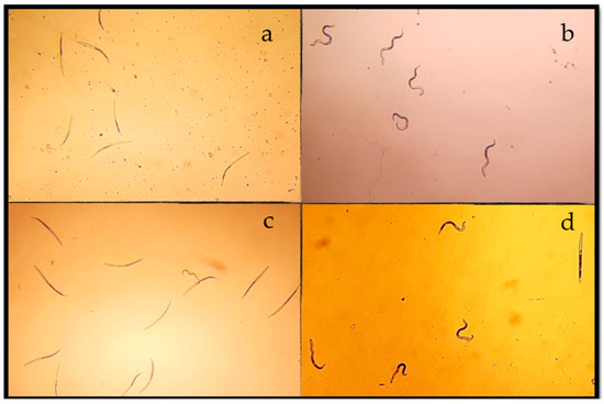 Eggs from N. aberrans were obtained from the gall-infested roots of tomato plants (Solanum lycopersicum), cultivated at the Instituto Politécnico Nacional, CIIDIR-IPN, Michoacán. The roots were initially washed with tap water and then cut into fragments measuring 1–2 cm. These fragments were subsequently immersed in a 1.5% NaClO solution, shaken for 3 min, and the resulting mixture was filtered through 75, 45, and 37 μm sieves before being rinsed with distilled water. The suspension retained on the sieve was then subjected to centrifugation at 3000 rpm. The precipitated phase was treated with 5 mL of MgSO4 (1.18 specific gravity), and the solution was centrifuged immediately at 3000 rpm for 3 min. The upper phase was collected on a 37 µm sieve, and the retained eggs were recovered after undergoing 4–5 washes with distilled water [80]. Freshly collected eggs were subsequently incubated in distilled water for 8 days at a temperature of 25 ± 1.0 °C to obtain J2 (Figure 4), as described by Vázquez-Sánchez et al. [81].