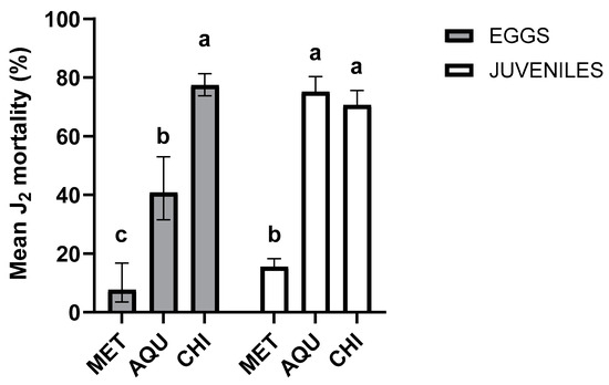 Effectiveness of AQU fraction (1 mg/mL) and Chitosan (CHI) compound (6 mg/mL) against J2 and eggs of N. aberrans. The scatter plots indicate the 95% confidence interval. Averages with different letters indicate significant differences (Tukey, p < 0.05). Eggs F(2, 15) = 129.1, p > 0.0001; juveniles (F(2, 42) = 296.8); p > 0.0001.