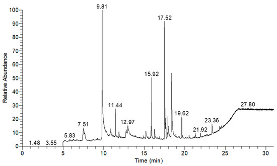 Table 3 shows the structures of the eight compounds detected in the AQU fraction through GC-MS analysis. The time retention ranged from 5–30 min (Figure 3), and the compounds belong to a range of chemical classes, including sugars, amino acid derivatives, phenols, fatty acid esters, and hopanoids, suggesting the diverse nature of the AQU fraction.