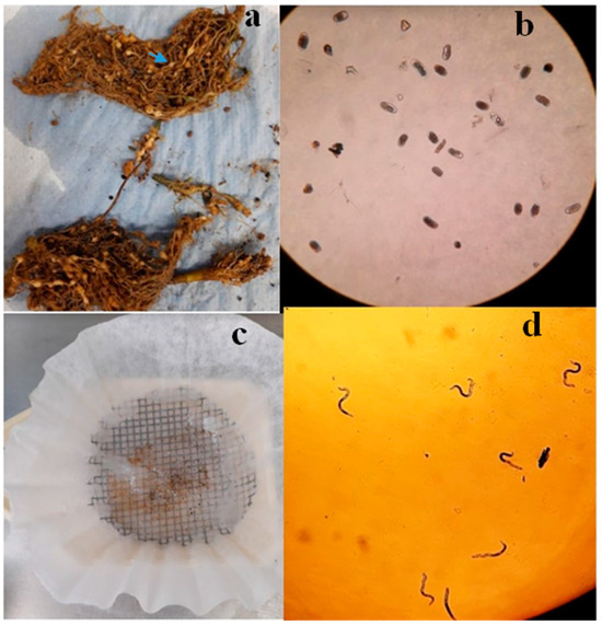 (a) Fresh roots infected with N. aberrans; blue arrow shows a knot induced by an adult female (40× magnification); (b) Fresh eggs extracted from the roots; (c) Fresh eggs incubated in distilled water; (d) J2 hatched.