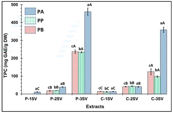 The TPC values were determined for eighteen extracts of PA, PB, and PP, and were illustrated in Figure 1. Statistically, the PA extracts showed higher TPC values than the PB and PP extracts (p ≤ 0.05). P fraction demonstrated a higher richness in TPC compared to C fraction (p ≤ 0.05). The data analysis showed that polar fractions have a significantly higher TPC concentration than apolar fractions (p ≤ 0.05). The 3SV extracts demonstrated the highest TPC values compared to those of the 1SV and 2SV extracts (p ≤ 0.05). Methanol was found to be the most effective solvent system for extracting phenolic compounds from different plant parts due to its capability to inhibit polyphenol oxidase activity, thus preventing phenolic compound oxidation []. The 1SV extracts showed the lowest TPC values (TPC < 10 mg GAE/g DW). The 2SV extracts showed moderate TPC values ranging from 17.95 to 43.53 mg GAE/g DW. PA-P-3SV and PA-C-3SV were observed to be 460.66 and 359.24 mg GAE/g DW respectively, presenting the highest extracts richness in TPC.