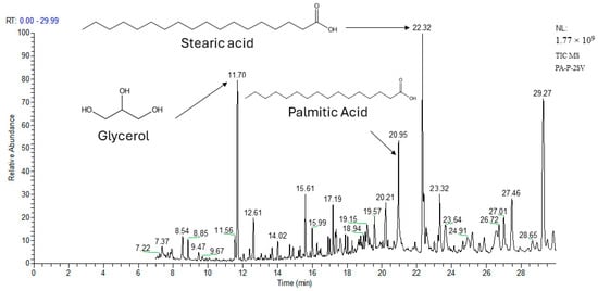 Compared to the literature, Fekih et al. [] revealed the identification of 49 volatile compounds through GC-MS analysis in various parts of P. halepensis, including needles, twigs, and buds, revealing the presence of caryophyllene oxide and bornyl acetate. Furthermore, Dhibi et al. [] identified palmitic acid and stearic acid in Pinus halepensis seeds and cones. Pasqualini et al. [] revealed the identification of various compounds, including protocatechuic acid, vanillic acid, p-coumaric acid, 4-hydroxybenzoic acid, vanillin, syringic acid, and gallic acid.