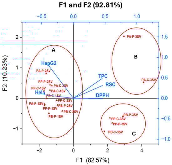 The most pronounced inhibition of cell growth was achieved by PA, followed by PP and PB with 1SV and 2SV extracts for Hela and HepG2 (p ≤ 0.05). However, a moderate to low inhibition potential was detected in 3SV extracts for all species. There are no significant differences in inhibitory effect between P and C. The 1SV exhibited a higher inhibitory effect on Hela cell lines up to 75% for PA and PP, followed by PB with 67.64%, compared to HepG2 cell lines. The same trend was observed with 2SV extracts where the inhibitory potential on Hela was higher than obtained on HepG2. Based on these findings, it appears that HeLa cells exhibit greater sensitivity compared to the HepG2 cell lines. This variation in sensitivity among different cell types has been observed in prior studies [,,].