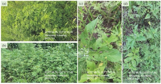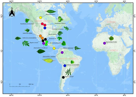 We consider two species of the same genus as a group and then subgroup them according to geographical origin differences. If both species are native to the same continent, we consider them of an identical origin (IO). For example, Ambrosia trifida and Ambrosia artemisiifolia are native and widespread in North America. On the contrary, Solanum rostratum (North America) and Solanum sarrachoides (South America) are native to distinct continents. Therefore, we consider them as plants of distinct origins (DOs) (Figure 1, Table S1). All seeds were collected from the field. Additionally, to account for possible regional variations, invasive species belonging to the same genus were collected from distinct geographical regions (thus prioritizing plants originating from different provinces or cities when collecting CIPs). Based on the ‘Chinese Alien Plant List’ and the Chinese Biobank (https://species.sciencereading.cn, accessed on 22 June 2021), we identified the experimental species as alien species []. Among them, we selected 16 alien species (7 families), all successfully established in China.