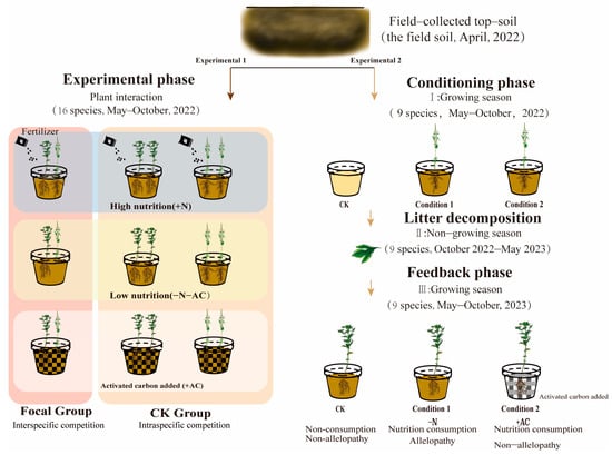 Experiment 2 addressed the effects of soil legacy (indirect allelopathy) and nutrition depletion on subsequent CIPs. During the soil treatment stage from May to October 2022, seedlings were carefully selected from each pot and cultivated throughout the growing season based on specific requirements (Figure 2, Table S3). We conducted experimental treatments under three conditions: the control group (no plants in the first year and no activated carbon added in the second year, designated as CK), condition 1 (plants in the first year and no activated carbon added in the second year, designated as −N), and condition 2 (plants in the first year and activated carbon added in the second year, designated as +AC). We planted the required number of each plant (9 species) and replicated each group eight times to give a total of 264 pots containing 176 plants. In order to replicate the natural growth conditions of plants in the field, we did not immediately remove plants; leaves were allowed to decompose naturally in the soil. We did this because of uncertainty about whether root exudate metabolites and leaf litter decomposition would have varying effects on the subsequent plants. Consequently, we removed the entire plant before conducting the soil feedback experiment in the second year. In the soil feedback stage, 264 pots and 264 plants (9 species) were planted under three conditions. Seedlings were selected per pot and cultivated throughout the growing season from May to October 2023. After 16 weeks of transplanting, we harvested the above-ground biomass by cutting the plants at ground level, and we harvested the below-ground biomass by washing the soil around the roots using high-ressure water. All biomass was dried until it reached a constant weight before being weighed.
