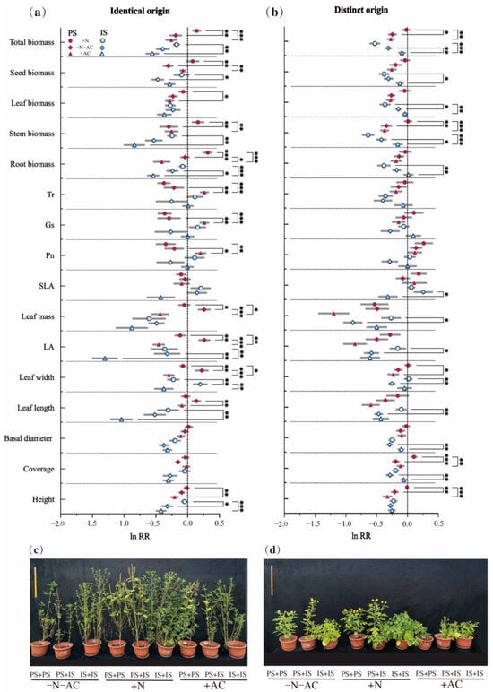 Xfocal represents the individual when the target species competes with neighbouring CIPs in interspecific interaction and XCK denotes the average total measurement of the target species in intraspecific interactions. The independent variables in this study were the experimental treatment conditions and the dependent variable was the response coefficient of the measurement index ln RR. This approach allowed for comparing competitive abilities among CIPs, regardless of plant size. For the convenience of analysis, we selected greater total biomass response coefficient values as predominant species (PS) in −N−AC and inferior species (IS) with lower values (Table S2). In the analysis, we examined the significance of plant origin on interaction and allelopathic legacy. We used a continuous index of allelopathy to test for the allelopathic legacy of CIPs in monocultures as follows []:
