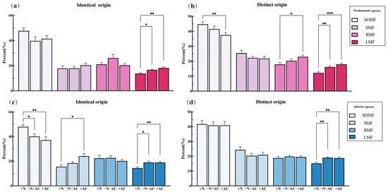 The relative changes in the proportion of biomass in (a,c) identical origin and (b,d) distinct origin species. SOMF: support organ mass fraction, SMF: seed mass fraction, RMF: root mass fraction, LMF: leaf mass fraction. *, p ≤ 0.05; **, p ≤ 0.01; ***, p ≤ 0.001. Values of p indicate significant differences. Values of p > 0.05 are not presented for clarity.