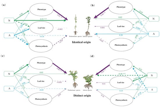 Structural equation model (SEM) of the effects of nutrition (N) and allelopathy (A) interactions on the fitness of the predominant species (a,c) and inferior species (b,d). Solid and dotted lines indicate positive and negative correlations, respectively. Green, blue, and purple lines illustrate the nitrogen, allelopathy, and plant growth traits path diagram related to plant fitness, respectively. N: Nitrogen, A: Allelopathy. *, p ≤ 0.05; **, p ≤ 0.01; ***, p ≤ 0.001. Values of p indicate significant differences. Values of p > 0.05 are not presented for clarity.