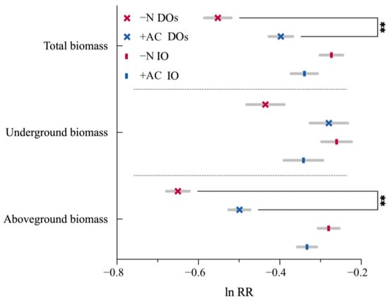 Soil treatments with congeneric invaders. DOs (×): CIPs native to distinct origins; IO (|): CIPs native to identical origins. **, p ≤ 0.01. Values of p indicate significant differences. Values of p > 0.05 are not presented for clarity.