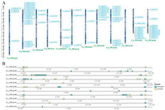 Distribution of the sugar transporter on the chromosome in pepper (Capsicum annuum). (A) All sugar transporter members were located on chromosomes. (B) Distribution of genes on the double strand. The chromosome numbers and sizes (Mb) are indicated at the bottom of each chromosome, respectively.
