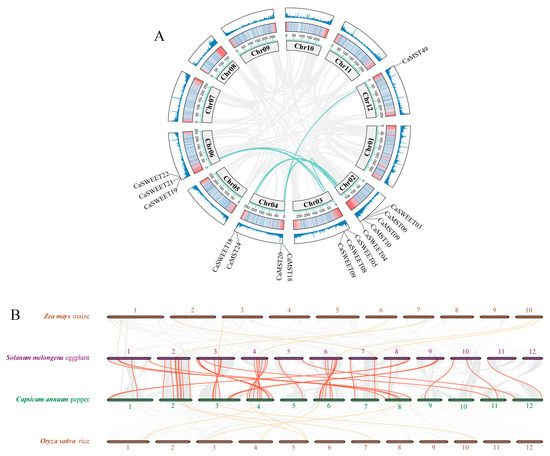 Duplication and synteny analysis of sugar transporter genes. (A) Schematic representations for the chromosomal distribution and inter-chromosomal relationships of pepper sugar transporter genes. (B) Synteny analysis of sugar transporter genes between pepper and eggplant, rice, and maize. The red lines highlight the synteny sugar transporter gene pairs.