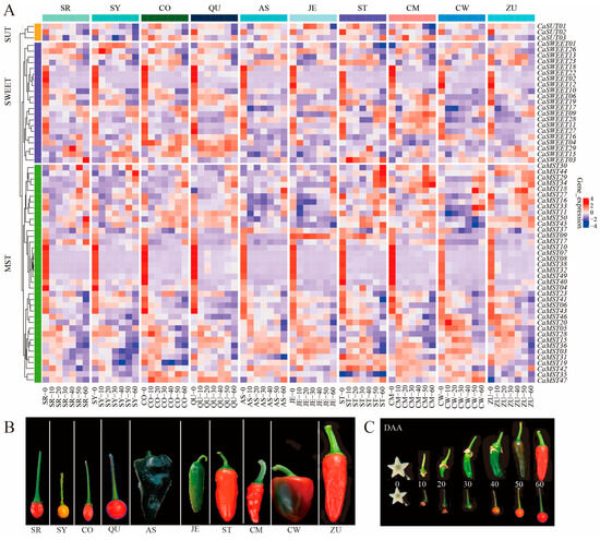 Heatmap of sugar transporter genes during different pepper fruits. (A) Expression profile of sugar transporter genes in six domesticated (AS, JE, ST, CM, CW, ZU) and four wild (SR, SY, CO, QU) varieties, (B) ten pepper varieties, (C) and pepper fruit developmental stages (0DAA, 10DAA, 20DAA, 30DAA, 40DAA, 50DAA, 60DAA; DAA: days after anthesis) [33]. The values in the image of heatmap are the averages of three biological replicates (log2(TMM + 1)). The images depicted in the manuscript are only representative of the sample’s appearance, and they are not to scale.