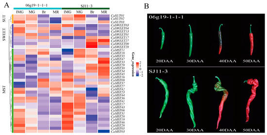 Expression profile of sugar transporter genes in SJ11-3 and 06g19-1-1-1. (A) Heatmap of sugar transporter genes and (B) pepper fruit developmental stages (20DAA, 30DAA, 40DAA, 50DAA; DAA: the day after anthesis) [34]. The values in the image of heatmap are the averages of three biological replicates. The images depicted in the manuscript are only representative of the sample’s appearance, and they are not to scale.