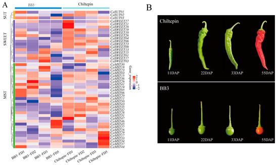 Expression profile of sugar transporter genes in BB3 and Chiltepin. (A) Heatmap of sugar transporter genes and (B) pepper fruit developmental stages (11DAP; 22DAP; 33DAP; 55DAP; DAP: the day after pollination) [35]. The values in the image of heatmap are the averages of three biological replicates. The images depicted in the manuscript are only representative of the sample’s appearance, and they are not to scale.