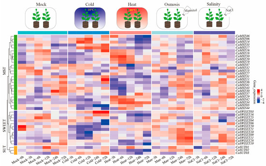 Heatmap of transcriptome expression of sugar transporter genes of pepper (CM334) leaves under abiotic stress (heat, cold, salinity, and osmotic) [36]. Each differently colored rectangle of the heatmap represents one gene. The values in the image are the averages of three biological replicates. Leaves were harvested at 3, 6, 12, 24, and 72 h after treatment. Plants (at the six-true-leaf stage) were treated with 50 mL of a 400 mM solution.