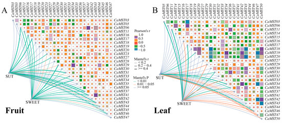 Mantel test analysis of the three sugar transporter families. (A) Correlation between SUT, SWEET, and MST gene families based on expression data of pepper fruit in different varieties. (B) Correlation between SUT, SWEET, and MST gene families based on expression data of pepper leaf in CM334 under stresses. Edge width corresponds to Mantel’s r statistic for the corresponding distance correlations, and edge color denotes the statistical significance. Pairwise comparisons of intestinal MST family members are shown, with a color gradient denoting Pearson’s correlation coefficient.