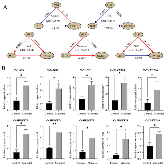 Genes expressed in all samples (leaf) under treatments were selected for PLS-SEM (Partial Least Squares Structural Equation Modeling) analysis to further explore the interaction between sugar transport families. The results showed that, under the normal growth environment simulated in the control group, the MST family showed a negative effect relationship for the SUT family, a positive effect relationship for the SWEET family, and SUT family had a negative effect relationship for the SWEET family (Figure 9A). Under salt stress and low temperature, the MST family showed a positive effect relationship with the SUT family. However, the results of the high-temperature treatment showed little difference from the normal conditions. At the same time, positive effects were shown among the three families under low-temperature stress, indicating that the sugar transport genes had stronger responses to low-temperature stress. Interestingly, under the conditions of osmotic stress simulated by mannitol, the relationship between the three families was exactly opposite to that under normal conditions. To further verify the expression characteristics of sugar transporter genes under a stressful environment, we selected 10 genes with the highest expression levels under mannitol treatment for qPCR analysis. The results showed that, except for CaSWEET06, the expression levels of the other nine genes were significantly higher than those of the control group after stress treatment. These results are generally consistent with transcriptome data, suggesting that there may be a complex synergistic relationship between sugar transporter genes in response to different stress environments (Figure 9B).