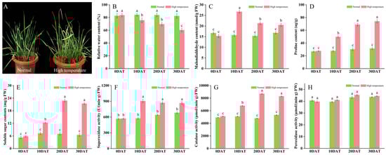 Effects of high-temperature stress on wheat plant development. (A) Plant morphology; (B) relative leaf moisture content; (C) malondialdehyde content (nmol/g FW); (D) proline content (µg/g); (E) soluble sugar content (mg/g FW); (F) superoxide dismutase activity (U/min·g FW); (G) catalase activity (µmol/min·g FW); and (H) peroxidase activity (µmol/min·g FW). Data are presented as means ± SD (n ≥ 5). Statistically significant differences between treatments and controls are indicated by different letters, based on Student’s unpaired two-tailed t-test (p < 0.05). The green bar chart represents normal conditions, while the red bar chart denotes high-temperature stress.