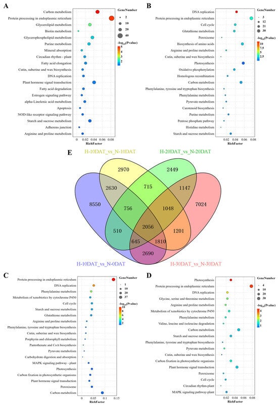 Identification and functional characterization of differentially expressed genes (DEGs) across all comparison groups. (A) H-10DAT_vs_N-0DAT; (B) H-10DAT_vs_N-10DAT; (C) H-20DAT_vs_N-20DAT; (D) H-30DAT_vs_N-30DAT; and (E) Venn diagrams showing DEGs among the four comparison groups (FDR < 0.05 and FC ≥ 2).